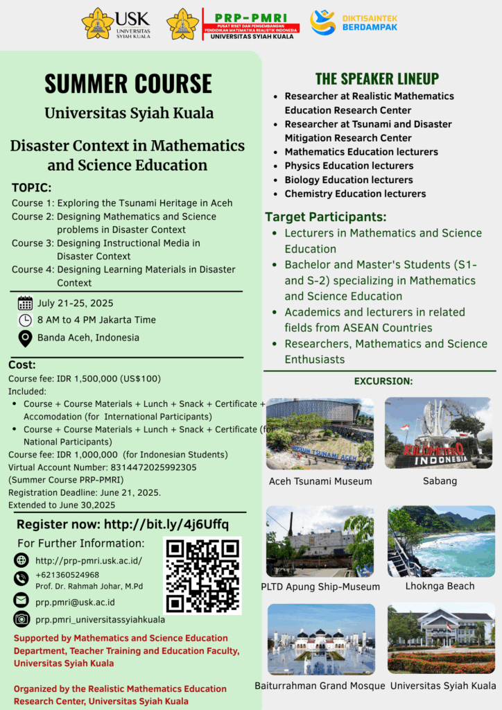 anda Aceh – Fakultas Keguruan dan Ilmu Pendidikan Universitas Syiah Kuala (FKIP USK) bekerja sama dengan Pusat Riset dan Pengembangan Pendidikan Matematika Realistik Indonesia (PRP-PMRI) USK menyelenggarakan program Summer Course internasional terkait mitigasi bencana...